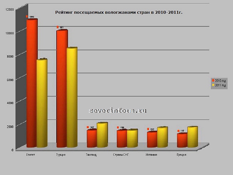 В 2012 году количество вологжан, посетивших эту страну, осталось примерно на том же уровне. В тройке лидеров по популярности также Египет и Тайланд. Далее идёт Греция, Испания и страны СНГ. По словам специалистов, на протяжении последних 5 лет количество выездов вологжан за границу возрастает. Если в 2008 году в других странах отдыхали порядка 25 тысяч человек, то к 2011 году эта цифра увеличилась до 37 тысяч.