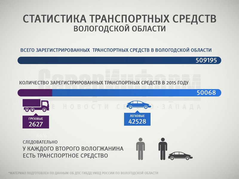 «В 2013 году в Вологодской области зарегистрировали 90,9 тысячи машин, мотоциклов, прицепов и т.п. В 2014 году эта цифра увеличилась до 91,2 тысячи. А за 9 месяцев количество зарегистрированных транспортных средств составляет более 50-ти тысяч. Среди них 42,5 тысячи легковых автомобилей и 2,6 тысячи грузовых», -сообщили корреспонденту ИА «СеверИнформ» в в ОБ ДПС ГИБДД УМВД России по Вологодской области.