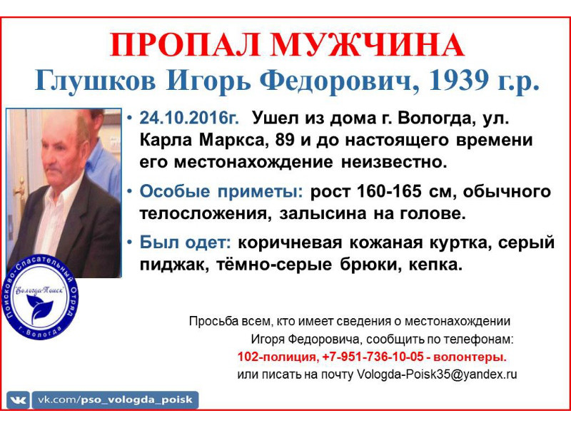Напомним, Игорь Фёдорович Глушков пропал 24 октября. Он ушёл из дома по улице Карла Маркса и до сих пор о нём не было никаких известий.