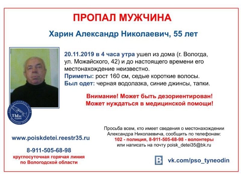 Мужчина может быть дезориентирован. Кроме того, вероятно, он нуждается в медицинской помощи. 55-летний Александр Харин пропал 20 ноября. В 4 часа утра он вышел из дома на улице Можайского, 42. С тех пор о вологжанине нет вестей. Поиском занялись волонтеры.