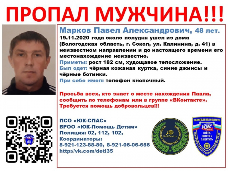 Всем, кто знает что-то о судьбе Павла Маркова, просьба позвонить по указанным телефонам, сообщает ИА "СеверИнформ".