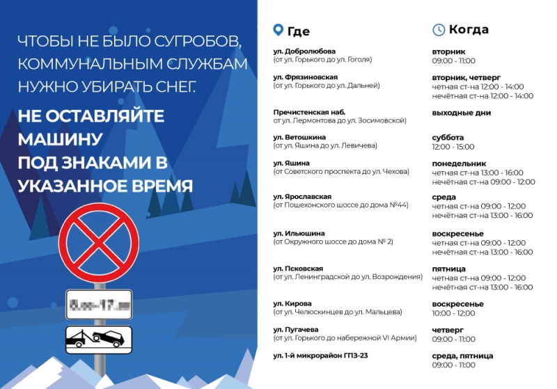 На 11 улицах установлены знаки, запрещающие остановку и стоянку машин в определенное время и дни. Это необходимо для того, чтобы коммунальщики смогли убрать снег и наледь на этих участках. Процесс занимает около 2-3 часов.