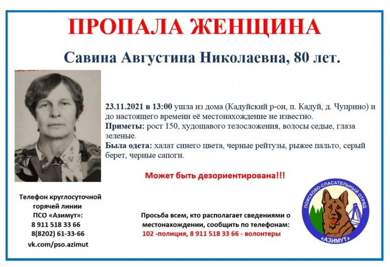 По данным ПСО «Азимут», бабушка ростом 150 сантиметров, худощавого телосложения. У нее седые волосы и зеленые глаза. Была одета в синий халат, черные рейтузы, рыжее пальто, серый берет, черные сапоги. Ситуацию осложняет то, что пенсионерка может быть дезориентирована.