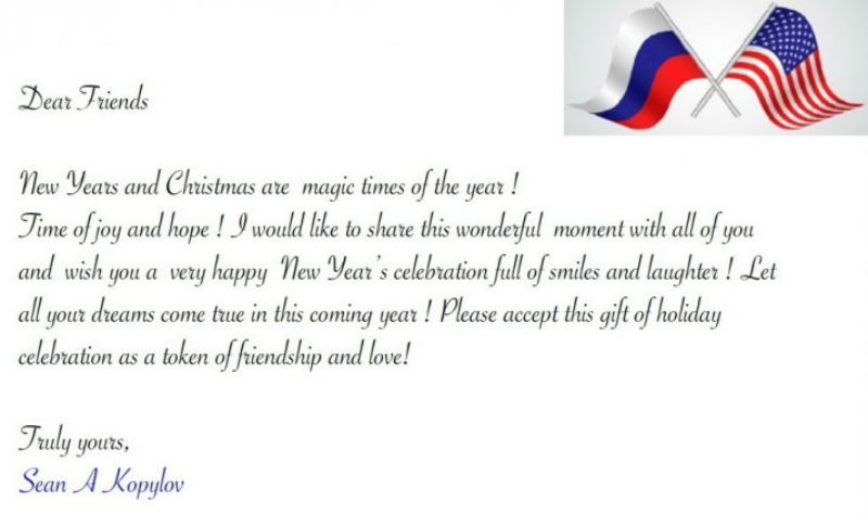 И вот в преддверии Нового года музейщики получили письмо из-за океана. Автор - 14-летний Шон. Мальчик живет в Бостоне, но интересуется своими корнями и историей семьи, пояснили в музее "Семенково". В преддверии Нового года Шон решил поздравить вологжан, проживающих на родине его предков. Позыв был одобрен на семейном совете.