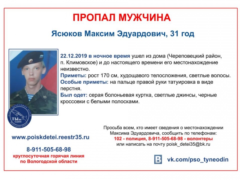 31-летний Максим Ясюков ушел из дома в поселке Климовское Череповецкого района ночью этого воскресенья, 22 декабря, и с тех пор его никто не видел.