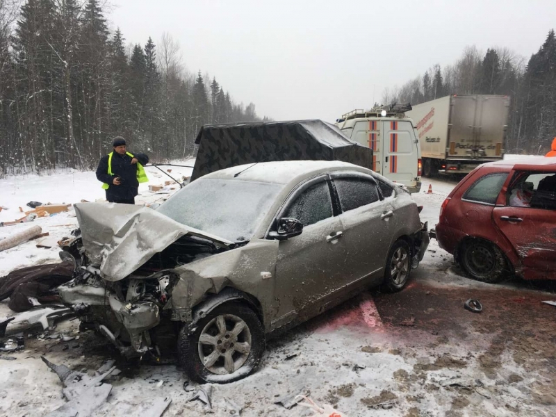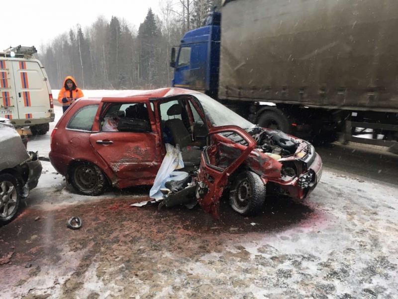Отечественный автомобиль и иномарка столкнулись в 9:40 на 73 км автодороги А 114 Вологда-Тихвин Р21 Кола.