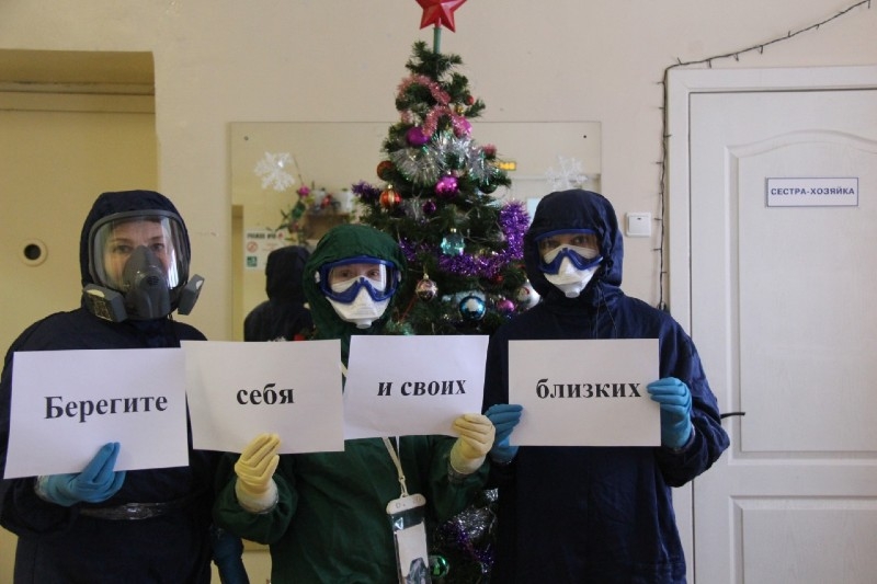 С каждым днем в социальных сетях появляются фотографии медиков из «красных зон» разных регионов России. Как пояснили в правительстве Вологодской области, первыми с подобной инициативой выступили сотрудники моногоспиталя городской больницы №1 в Вологде. К участию во флешмобе вологодские врачи подошли с креативом: в «красной зоне» украсили новогоднюю ёлку листочками с самым главным пожеланием – Новый год без COVID-19.