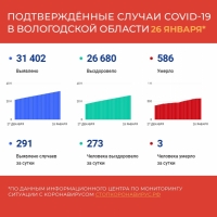 Вновь менее трехсот: 291 новый случай заболевания коронавирусом выявлен на Вологодчине за минувший день. Таким образом, на 26 января, в регионе официально подтверждены 31402 случая заражения COVID-19. В настоящее время с недугом борются 4136 вологжан.