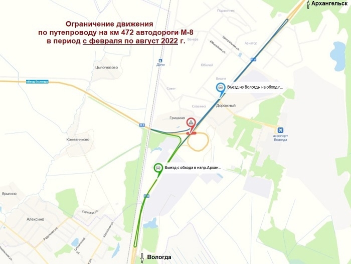 На путепровод со стороны Архангельска заехать можно будет, как и сейчас. Также изменения не коснутся выезда с обхода в направлении Вологды.