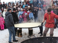 Так же, как и накануне, блин выпекали на большой сковороде, поднять которую могут не менее четырех человек одновременно. Переворачивали главное масленичное угощение с помощью двухметровой скалки, принесли которую тоже несколько человек. Скалку прокатили от одного края сковороды до другого, а в это время на нее наматывали блин, который после размотали в обратном направлении – так, что он лег на сковороду не пропеченной стороной.