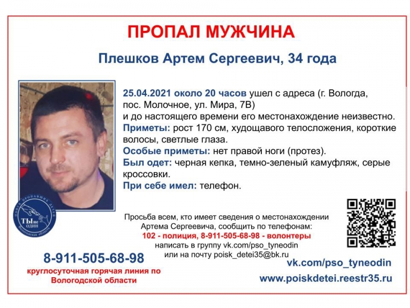 Мужчину с протезом ноги ищут в Вологде Фото:ПСО "Ты не один"