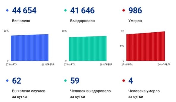 Таким образом общее число заболевших с начала пандемии достигло 44654 человек. Выздоровели 41646 пациентов, в том числе, 59 за последние сутки.