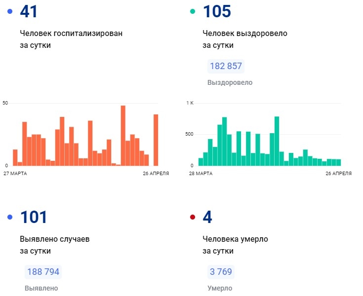 Выздоровели свыше 182,8 тысячи человек. Скончались 3769 пациентов, в том числе, 4 за минувшие сутки. В больницы попал еще 41 пациент.