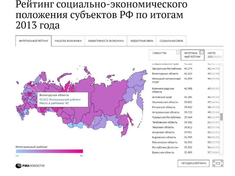 В рейтинге социально-экономического положения регионов Вологодская область заняла 43-е место. Соответствующее исследование за 2013 год провело агентство «РИА Рейтинг». При этом, по сравнению с аналогичным периодом 2012 года, позиции области снизились сразу на 11 пунктов — больше, чем у какого-либо другого субъекта РФ.