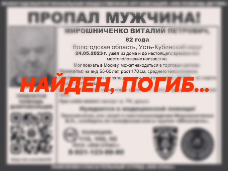 82-летний житель Усть-Кубинского района ушел из дома в неизвестном направлении. Это случилось 24 мая. Позднее начались поиски пенсионера. Беспокойство вызывал тот факт, что из-за слабого здоровья мужчина нуждался в медицинской помощи.