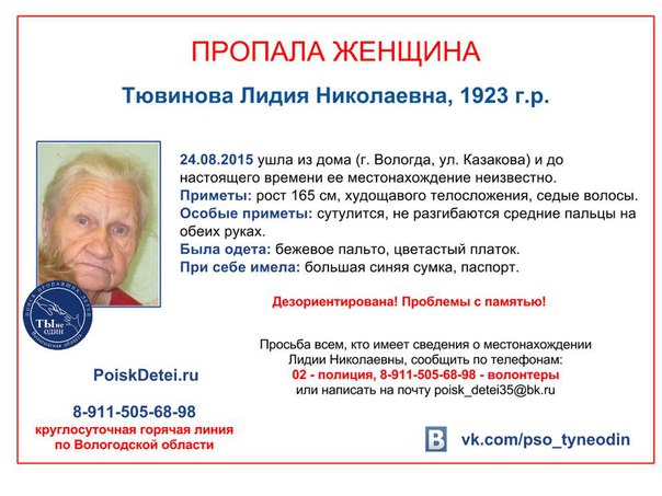 Пенсионерка ростом около 165 сантиметров, худощавого телосложения, у нее седые волосы. Из особых примет — женщина сутулится. У Лидии Тювиновой с собой имелась синяя сумка и паспорт. Вологжанка была одета в бежевое пальто и цветастый платок, сообщает ИА «СеверИнформ» со ссылкой на ПСО «Ты не один».