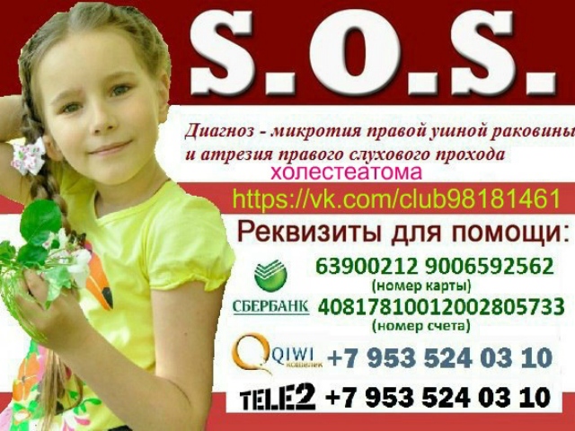 «Диагноз Марины — микротия правой ушной раковины и атрезия правого слухового прохода, осложненная холестеатомой - это опухоль в среднем ухе. Она своим ростом заполняет все пространство, и тем самым разрушает костную ткань. Если её не удалить, то ждут очень серьезные последствия (парез лицевого нерва, менингит). В 2013 году в России уже была проведена операция по удалению холестеатомы, но увы, опухоль опять растет. Благодаря вашей помощи у нас может появиться возможность провести операцию в Калифорнии. Нам согласны помочь два доктора, они проведут 3 операции за 1 раз. Помогите Маришке остаться здоровой», - пишут родители школьницы.