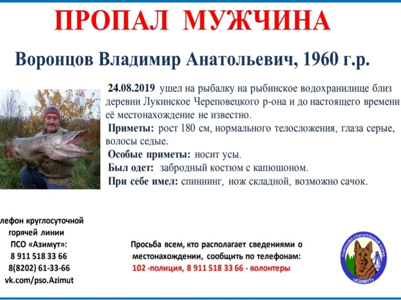 Они потерялись 24 августа. Первый мужчина отправился на рыбалку неподалеку от деревни Лукинское Череповецкого района. 59-летний Владимир Воронцов ростом 180 сантиметров, носит усы. У него нормальное телосложение, серые глаза. Был одет в забродный костюм, при себе имел спиннинг, складной нож, возможно, сачок.