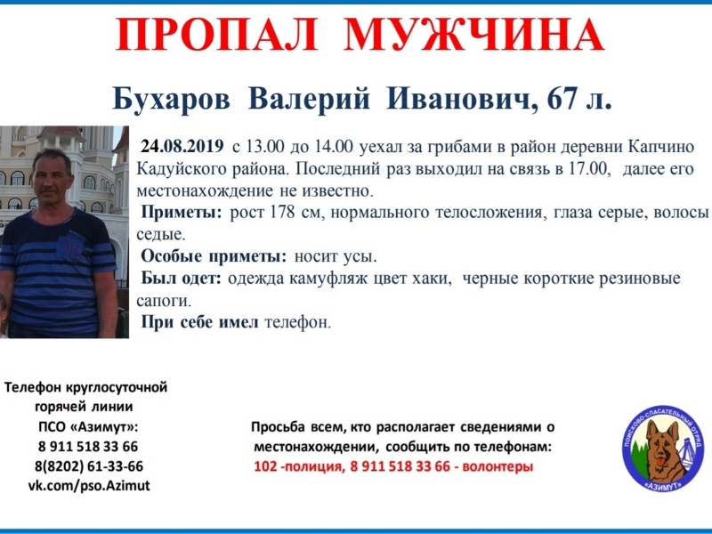 Второй человек пропал в Кадуйском районе. 67-летний Валерий Бухаров ушел за грибами в лес неподалеку от деревни Капчино. В последний раз выходил на связь в 17 часов 24 августа. Дальнейшие передвижения грибника не известны. Мужчина ростом 178 сантиметров. У него нормальное телосложение, серые глаза, седые волосы, усы. Был одет в камуфляжный костюм, короткие черные резиновые сапоги. С собой имел телефон.