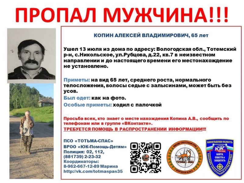 Всех, кто знает что-то о местонахождении тотьмича, просят позвонить по указанным номерам, сообщает ИА «СеверИнформ».
