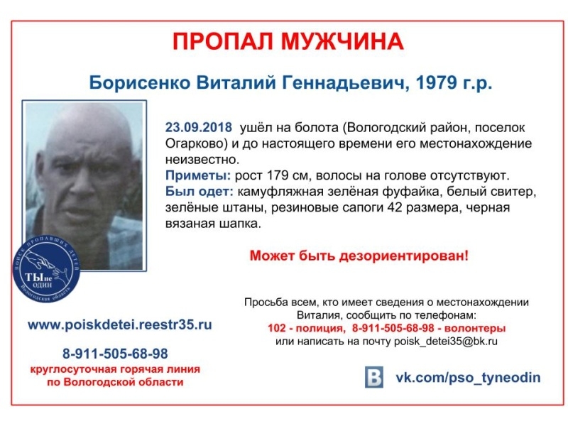 Приметы пропавшего: рост 179 см, лысый, был одет в камуфляжную зеленую фуфайку, белый свитер, зеленые штаны, черную вязаную шапку и резиновые сапоги 42-го размера. Всех, кто что-то знает о местонахождении Виталия Борисенко, просят обратиться в полицию по телефону 102, либо позвонить на «горячую линию» волонтеров ПСО: 8911-505-68-98, также можно написать на электронную почту poisk_detei35@bk.ru, сообщает ИА «СеверИнформ».