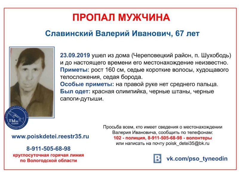 67-летний Валерий Славинский ушел из дома в деревне Шухободь 23 сентября. С тех пор местонахождение пенсионера неизвестно. К поискам подключились волонтеры.