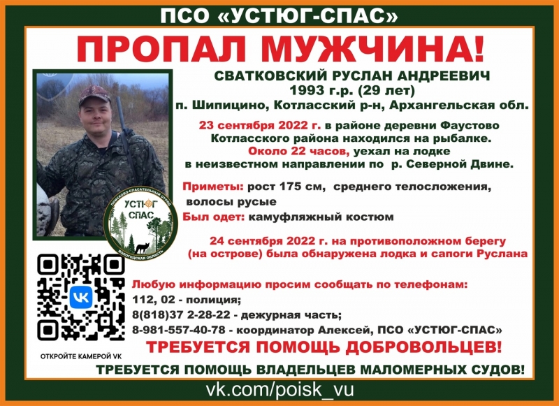 Приметы котлашанина — рост 175 сантиметров, среднего телосложения, русые волосы. Был одет в камуфляжный костюм. Для поисков требуются добровольцы. Желающим помочь нужно позвонить по указанным телефонам, сообщает ИА «СеверИнформ».