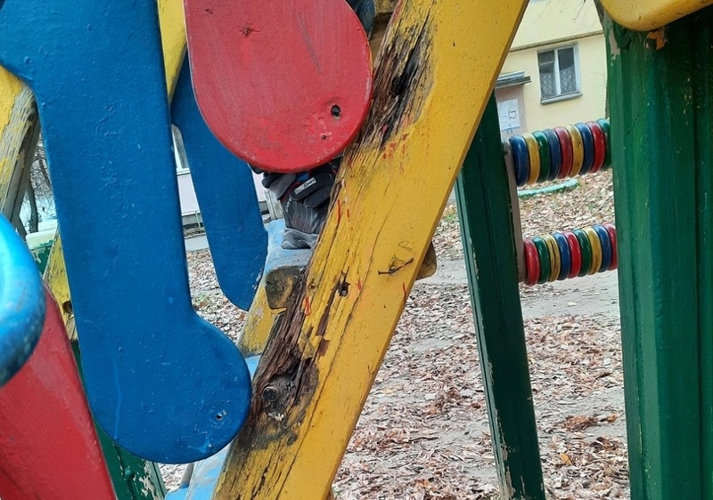 Двор обычно многие родители считают безопасной зоной для прогулок. Часто мама сидит на скамейке с телефоном, а ребенок развлекается на детской площадке, если такая имеется. Но вот одна из родительниц заметила, что горка во дворе на Чернышевского, 91 недостаточно прочная. Вернее сказать, медленно разваливается по частям. Первой среди "отщепенцев" оказалась лестница, по которой дети забираются на конструкцию.