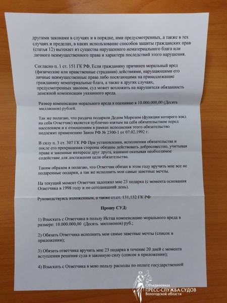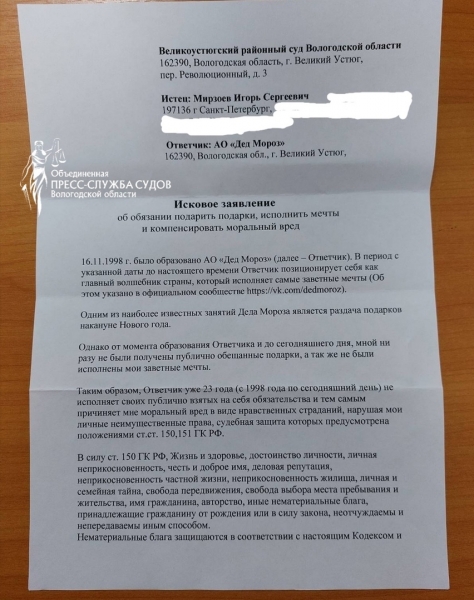 Напомним, юрист из Санкт-Петербурга подал в суд на АО «Дед Мороз», потому что зимний волшебник не выполняет публично взятые на себя обязательства. С момента образования, то есть уже больше 23 лет не выполняет заветные желания Игоря Мирзоева и не дарит подарки. Он просит компенсировать моральный вред, который оценил в 10 миллионов рублей. Также в числе требований – вручить 23 подарка и исполнить мечты. Фотографии иска публикует объединенная пресс-служба судов Вологодской области.