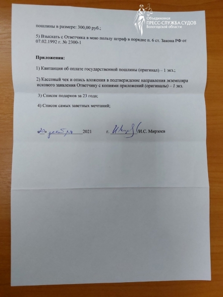 Гражданский иск Игоря Мирзоева зарегистрировал Великоустюгский районный суд. Не указан список подарков и заветных мечтаний. Также среди документов нет квитанции об оплате госпошлины.