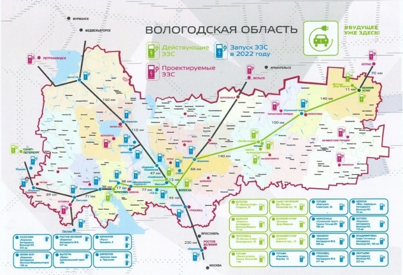 Руководство района подписало соглашение о сотрудничестве с Ассоциацией владельцев электромобильного, беспилотного и подключенного транспорта и инфраструктуры Вологодской области. В результате открылась первая ЭЗС в центре города. Вторая заправка откроется в Вотчине Деда Мороза. Третью передали администрации района, предстоит определить место для дальнейшей установки.