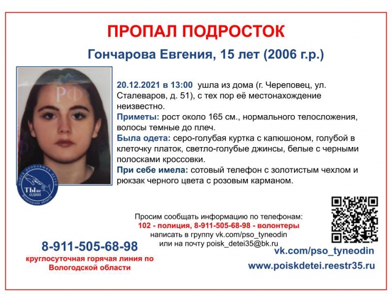 Евгения Гончарова ушла из дома еще днем 20 декабря. Подросток живет на Сталеваров, 51. С тех пор неизвестно, где школьница находится. Информацию о пропаже распространяет ПСО «Ты не один».