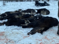 Бригада охотников расстреляла 20 лосей. Животных загнали в одну кучу и перестреляли фактически в упор. Причастные задержаны, дело находится на контроле губернатора. Об инциденте в соц.сетях рассказал биолог-охотовед Валерий Кузенков. По его словам, организатор возможной бойни — председатель райохотобщества. Итог этой охоты: 12 коров, 5 быков и 3 теленка. Все снимали на видео. Оператор успел убежать.