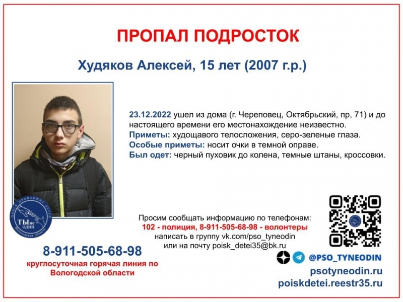 ПСО «Ты не один» публикует примет пропавшего. Он худощавого телосложения, с серо-зелеными глазами. Носит очки в темной оправе. Был одет в черный пуховик до колена, темные штаны, кроссовки.