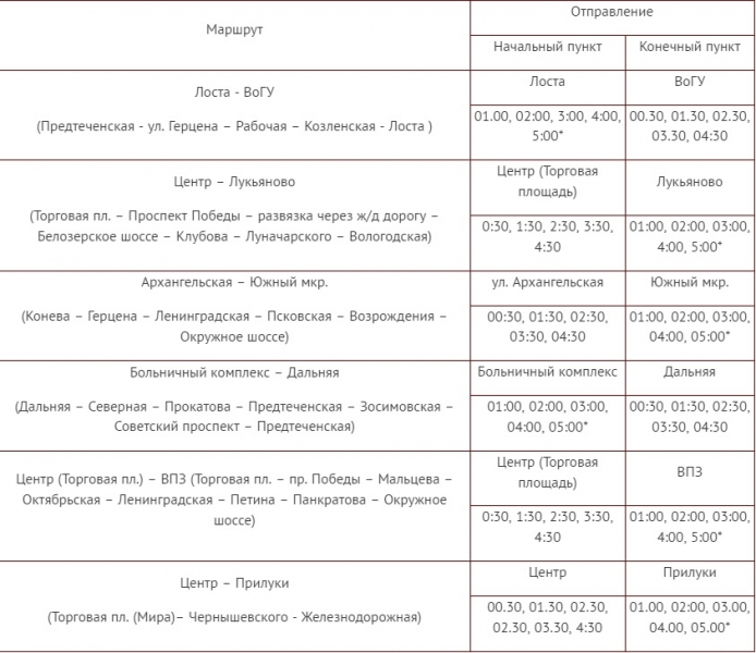 По данным администрации города, маршруты будут такими: «Лоста – ВоГУ», «Лукьяново – Центр», «Южный мкр – Архангельская», «Дальняя – Больничный комплекс», «ВПЗ – Центр», «Прилуки – Центр».