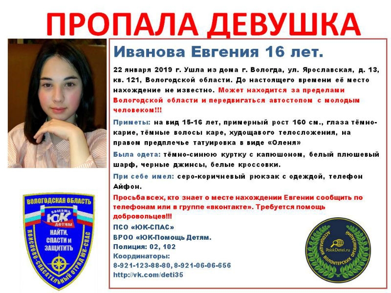 По информации поисково-спасательного отряда ЮК-СПАС, она может находиться за пределами Вологодской области и ехать автостопом, возможно не одна, а с молодым человеком.