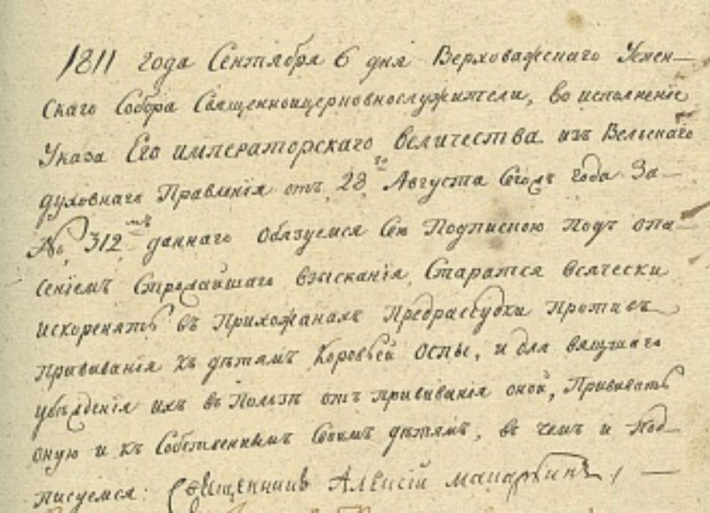 "Указом Его императорского величества Александра I от 28 августа 1811 года священно-церковнослужители «под опасением строжайшего взыскания» были обязаны «стараться всячески искоренять в прихожанах предрассудки против прививания к детям коровьей оспы, и для вящшего убеждения их в пользе от прививания оной, прививать оную и к собственным своим детям» (Пунктуация сохранена в соответствии с документом)