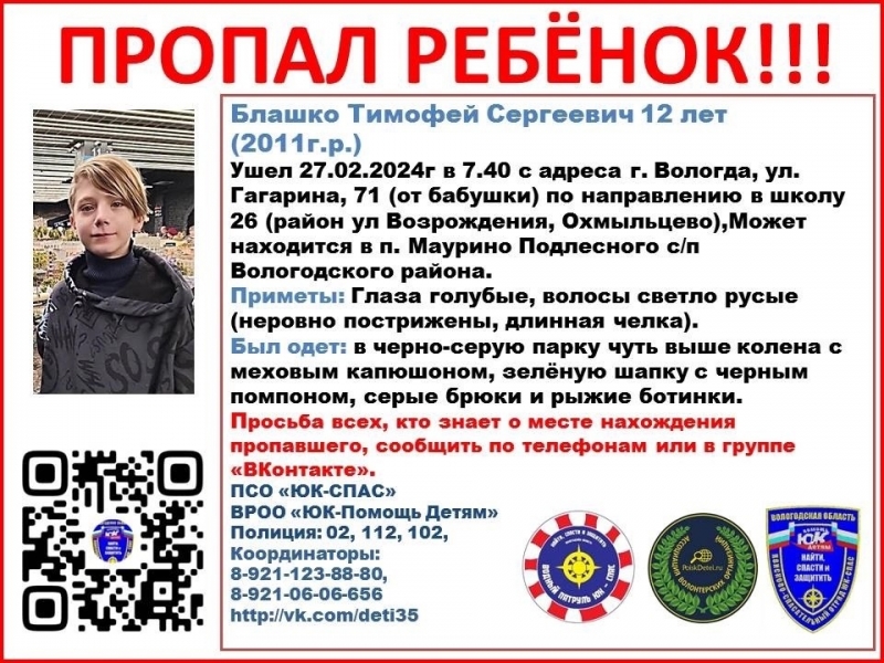 Мальчик вместо школы ушел в неизвестном направлении. 12-летний подросток должен был пойти утром 27 февраля от бабушки, живущей на Гагарина, 71. В школе №26 парень не появился. Возможно, он находится в поселке Маурино Подлесного сельского поселения.