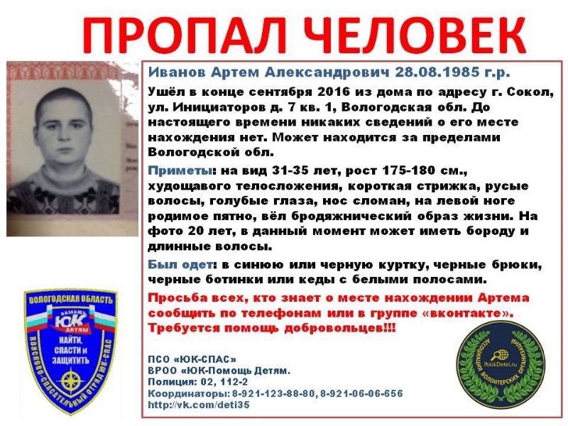 В Вологодской области разыскивают Артёма Иванова. 32-летний мужчина ушёл из дома в городе Соколе в конце сентября 2016 года. С тех пор о нём ничего неизвестно.