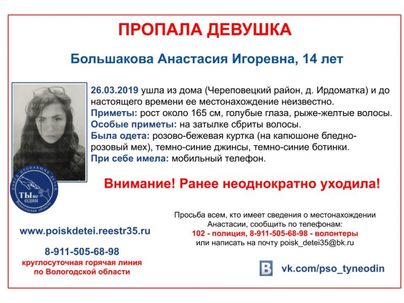Юную жительницу Череповецкого района во второй раз с начала февраля этого года объявил в розыск поисково-спасательный отряд «Ты не один». По информации волонтеров, 14-летняя Анастасия Большакова исчезла вчера, 26 марта. Ранее девочку разыскивали 4 февраля (нашли живой и невредимой), причем уже тогда указывалось, что она имеет склонность к побегам из дома.
