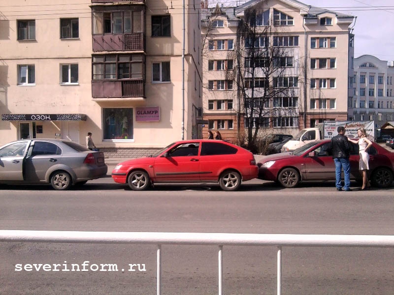 Три легковушки столкнулись в центре Вологды, сообщает ИА «СеверИнформ — Новости Вологды». Авария произошла в пятницу, 27 апреля, около 14-30 на улице Ленинградской неподалеку от ее пересечения с Кирова. По словам очевидцев, там выстроились в ряд «Chevrolet», «ВАЗ» двенадцатой модели и «Mitsubishi». В последнем автомобиле находился маленький ребенок — мальчик приблизительно пяти лет. Никто из участников дорожно-транспортного происшествия не пострадал. По всей вероятности, причиной ДТП стало несоблюдение дистанции.