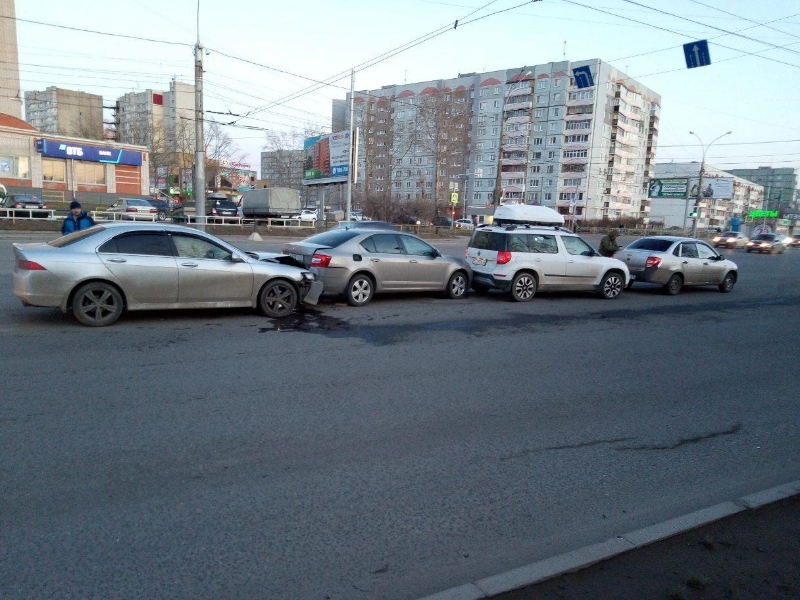 23-летняя девушка на автомобиле "Хонда Аккорд" врезалась в "Шкоду Октавия". Эту иномарку отбросило на стоящую впереди "Шкоду Йети", а ее откинуло на "Ладу Гранта".