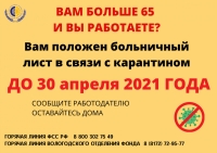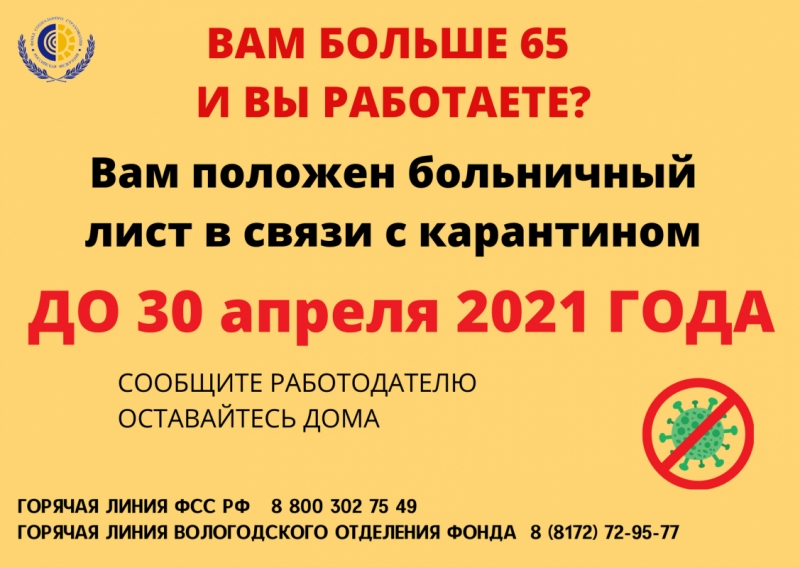 Как информирует вологодское региональное отделение Фонда социального содействия, режим самоизоляции для них продлен на несколько дней, до конца апреля. А значит, до этой даты они могут продлить больничный лист.