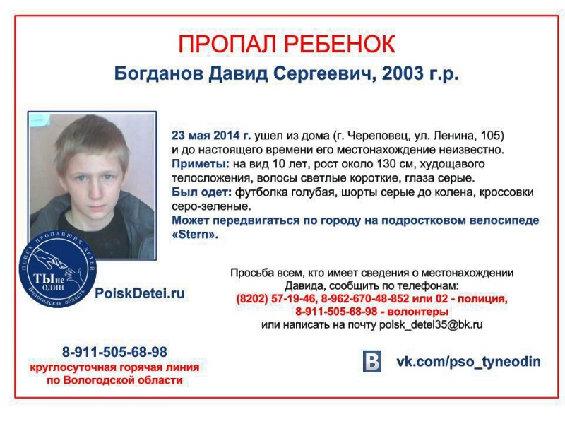 «На вид школьнику 10 лет, его рост около 130 сантиметров. Мальчик худощавого телосложения. У ребенка короткие светлые волосы, серые глаза. Давид был одет в голубую футболку, серые шорты до колена, серо-зеленые кроссовки. По городу может ездить на велосипеде марки «Stern», - сообщает ИА «СеверИнформ» со ссылкой на группу поискового отряда «Ты не один».