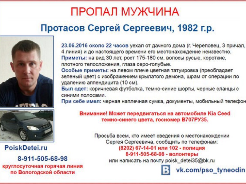 В Череповце разыскивают 34-летнего Сергея Протасова. 23 июня этого года около 22 часов мужчина уехал от дачного дома в Череповце в районе 3-го причала, и до сих пор о нём ничего неизвестно.