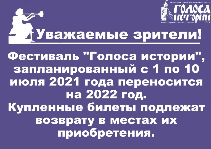 Театральный фестиваль "Голоса истории", запланированный с 1 по 10 июля, переносится на 2022 год. Купленные билеты подлежат возврату в местах их приобретения. Возврат средств будет осуществляться после получения театром официального уведомления об отмене фестиваля.