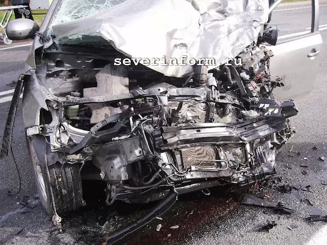 После столкновения один из автомобилей отбросило на дорожный знак, который установлен на перекрестке. В результате легковушка сильно повреждена.