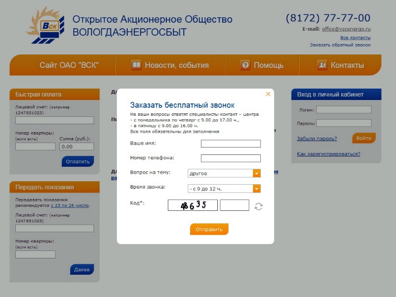 Сервис доступен на сайте энергокомпании вологдаэнергосбыт.рф на главной странице «личного кабинета». Для того, чтобы воспользоваться услугой, нужно заполнить несложную форму по ссылке «заказать обратный звонок»: