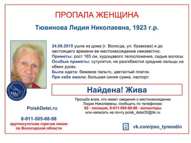 Лидия Тювинова ушла из дома в Вологде 24 августа. Пенсионерка имеет проблемы с памятью и дезориентирована. Женщину также смогли отыскать - благодаря распространению информации в сети Интернет.
