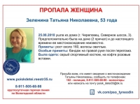 Пропавшую женщину разыскивают волонтеры и полиция в Череповце. По информации поисково-спасательного отряда «Ты не один», 53-летняя Зеленина Татьяна Николаевна ушла из дома на Северном шоссе, 3 в субботу, 25 августа. Предположительно она была на даче на 2-м причале, с тех пор ее местонахождение неизвестно.